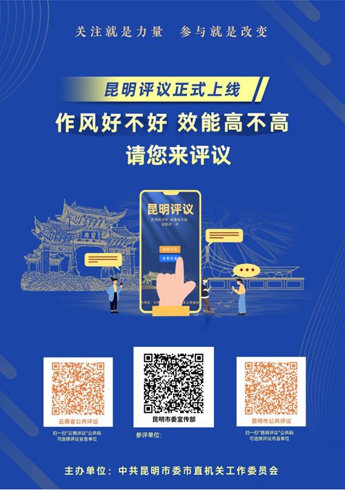为牢固树立以钉钉子精神抓落实的工作理念,大力弘扬“马上就办、真抓实干”的工作作风,在“服务企业、服务群众、服务基层”中强化责任意识、提高工作标准、转变机关作风,推动市级机关在大抓作风革命效能革命、深化“当好排头兵”高质量发展大竞赛活动中取得的新突破、新成效,全力打造让群众满意的服务型效能型机关,现面向社会各界公开“昆明评议”微信扫码即时评价渠道,广泛接受群众的评价监督。