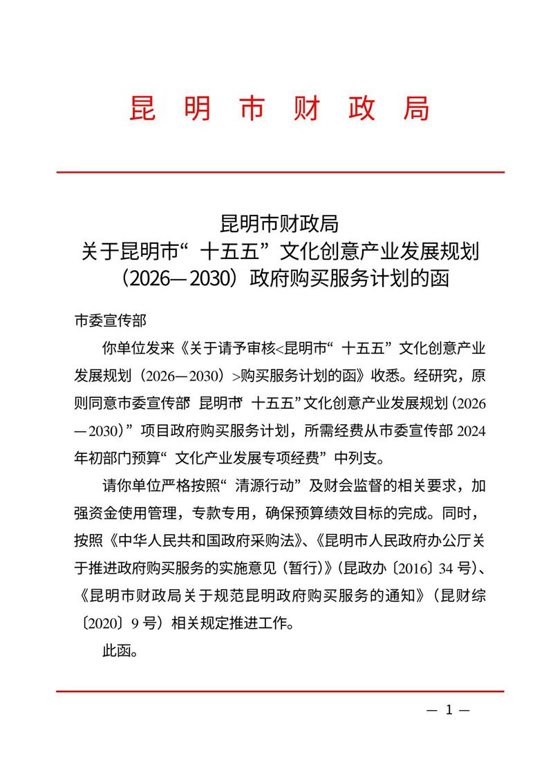 根据《昆明市文化产业发展专项资金管理办法》等相关政策,为进一步加强资金使用跟踪,规范文产资金使用,经研究,拟采用政府购买服务的方式,聘请第三方专业机构共同编制《昆明市“十五五”文化创意产业发展规划(2026—2030)》,制定购买服务计划如下: